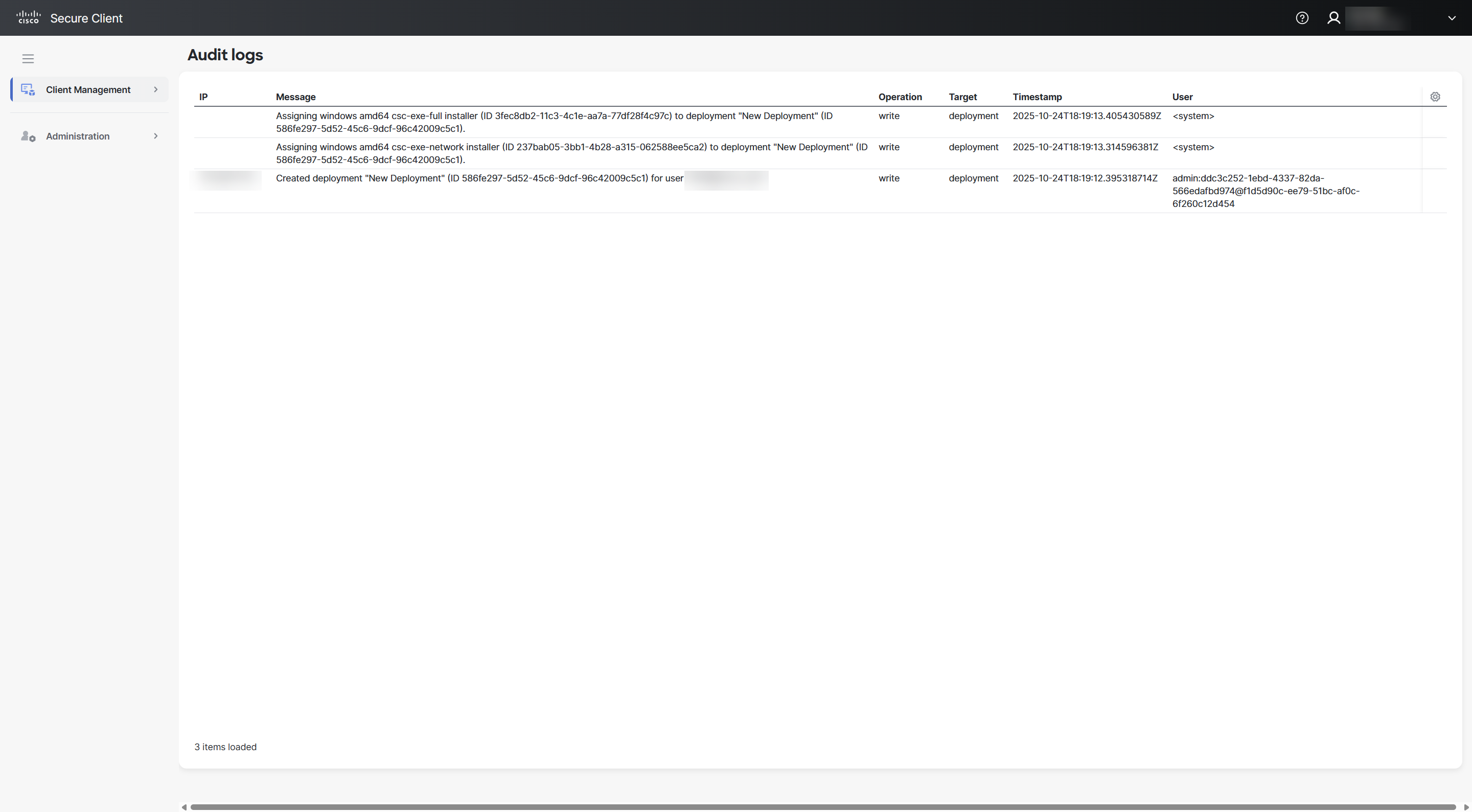 Audit logs provide a record of creation, modification, or deletion tasks performed by users in your Secure Client Cloud Management organization. It includes the IP address, action taken (Message), Operation, Target, Timestamp, and User details.