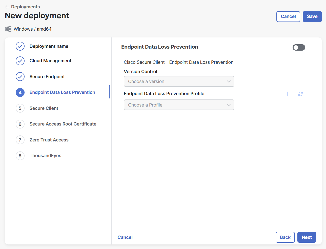 Click the toggle to enable Endpoint Data Loss Prevention. Cisco Endpoint Data Loss Prevention (Endpoint DLP) enables you to protect sensitive data on endpoints by controlling what data is transferred to external devices. It extends your organization’s data protection policies to the endpoint. For more information, see the Manage Endpoint Data Loss Prevention Using Cisco Secure Client documentation in the Cisco Secure Access Help. If you do not want to include the module, do not click the toggle and proceed to step 12.